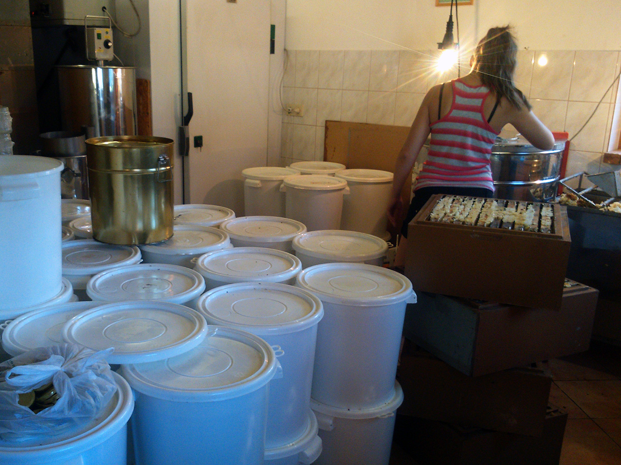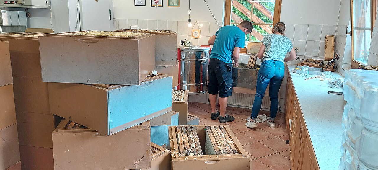 Die Honigwaben werden von den Bienenstöcken genommen und mit Leerwaben ersetzt. Zu Hause im Schleuderraum werden die Waben entdeckelt, (die Wachsschicht von den Zellen entfernt) und dann gechleudert. Der Honig wird mehrfach gesiebt und einige Tage ruhend gelassen, damit sich die kleinen Lufteinschlüsse zu einer Schaumschicht oben sammelt.