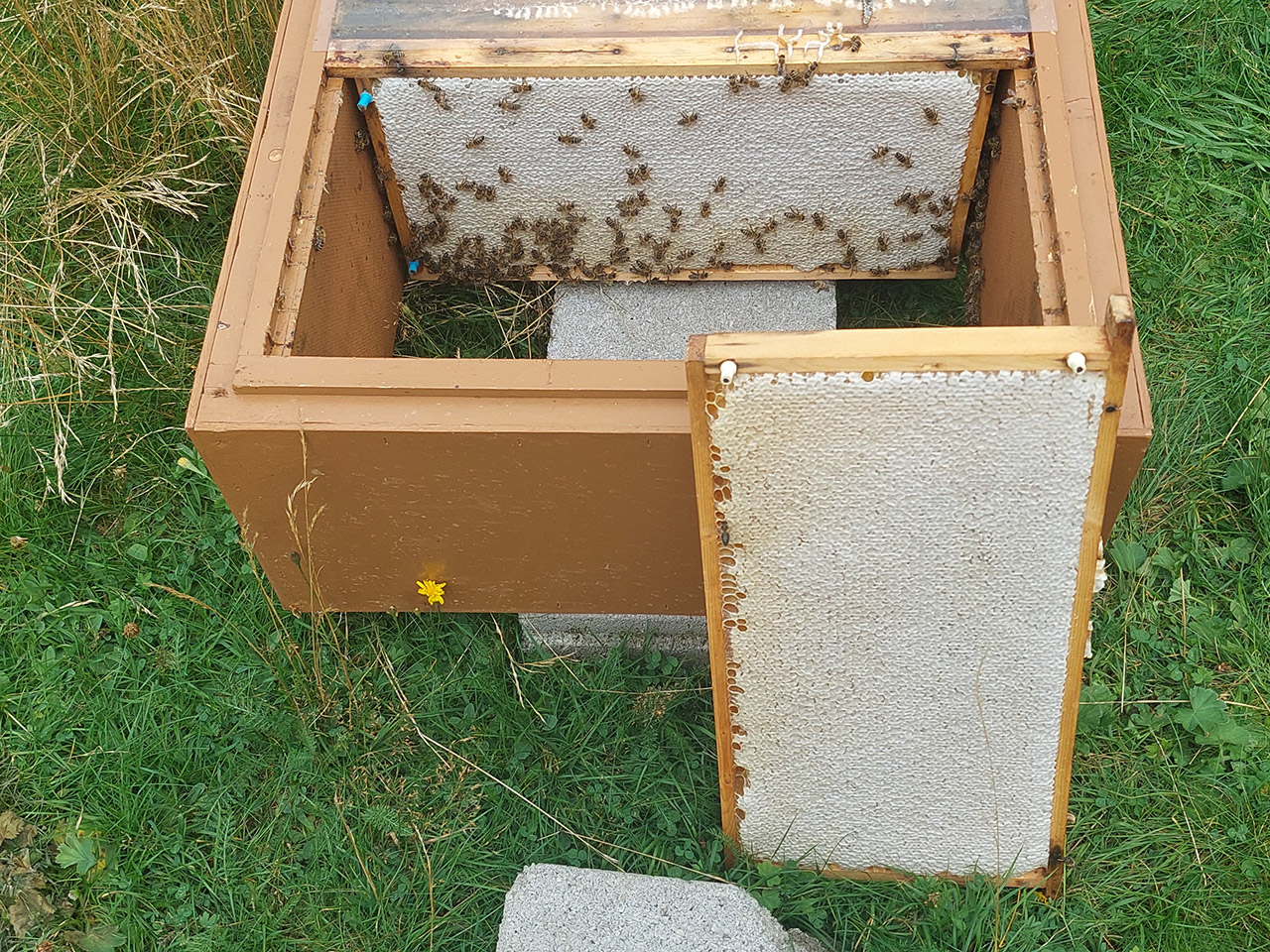 Wir können bei unseren sanftmütigen Bienen immer ohne Schutzkleidung arbeiten, auch die Kinder.